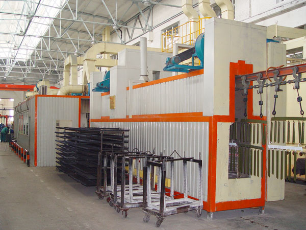 电脑机箱外壳涂装生产线由人工上下工件区、工件输送线、前处理系统、脱水炉、喷粉室、上下往复机系统、供粉系统、固化炉、加热系统、冷却系统组成。