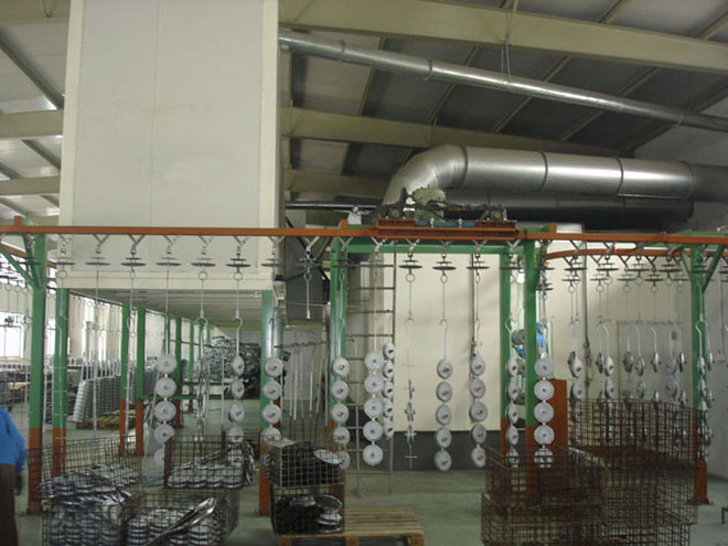 固定塑胶垫静电自动喷涂设备由人工上下工件区、工件输送线、除尘系统、预热系统、喷漆室、上下往复机系统、工件旋转系统、供漆系统、洁净鲜风供给系统、废气排放系统、烘干炉、加热系统、冷却系统组成。