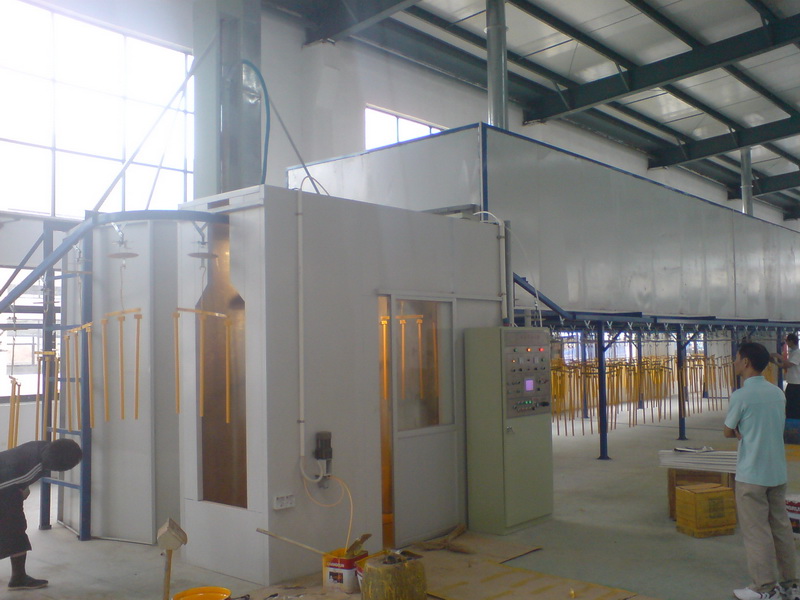 采用专用五吨悬挂式输送链输送线,采用变频控制,线速为0--6m/min;选用独特Ω型喷漆室,配7.5HP离心式排风机;