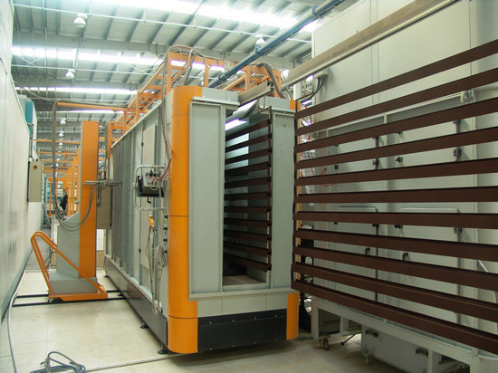 铝型材静电粉末涂装生产线由人工上下工件区、工件输送线、除尘系统、喷粉室、gudi、供粉系统、洁净鲜风供给系统、废气排放系统、烘干炉、加热系统、冷却系统组成。