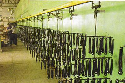 人工上件——手动除尘——自动静电除尘——往复式自动喷涂——烘干炉烘干——自然冷却——人工下件