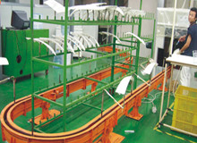 人工上下件、自动输送线、手动除尘、静电自动除尘、喷涂机器人、自动喷涂系统、无尘喷涂室、漆雾排除系统、恒温恒湿送风系统、高效均压箱、产品表面留平、烘干隧道炉、自然风冷却系统、PLC中央控制系统、废水废气处理系统。