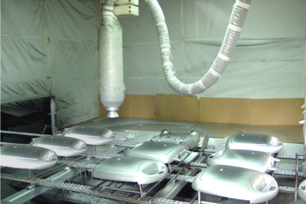 探照灯背板旋杯涂装生产线由人工上下工件区、工件输送线、除尘系统、预热系统、喷漆室、平面往复系统、供漆系统、洁净鲜风供给系统、废气排放系统、烘干炉、加热系统、冷却系统组成。